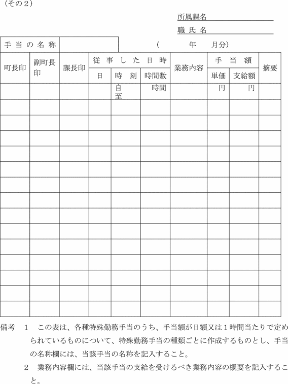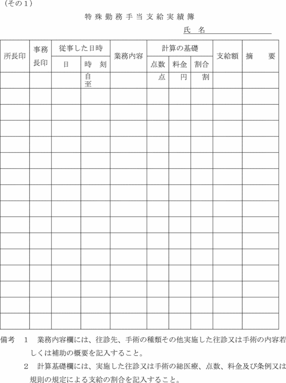 第8条 所属の長は、特殊勤務手当(月額により支給するものを除く。)の支給を受ける職員があるときは、特殊勤務手当の種類、職務の内容、職務に従事した日時及びその時間等支給上必要な事項並びにその支給額を特殊勤務手当支給実績簿(