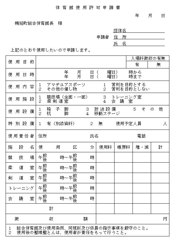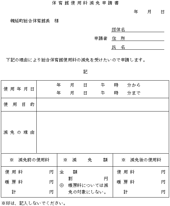 第9条 条例第4条第3項の規定により使用料の減免を受けようとする者は、総合体育館使用料減免申請書(