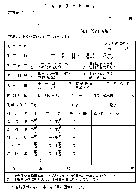 第5条 条例第2条第1項の規定により、体育館の使用許可を受けようとする者は、使用日の3か月前から3日前までに総合体育館使用許可申請書(