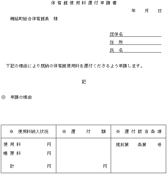 第10条 条例第5条ただし書の規定により使用料の還付を受けようとする者は、総合体育館使用料還付申請書(