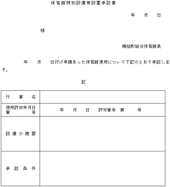 第11条 条例第7条に規定する特別の設備をし、又は特殊物件を搬入する者は総合体育館特別設備等設置承認申請書(