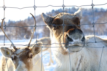 現在、トナカイ観光牧場には約30頭のトナカイたちが暮らしています。トナカイは、北極圏をとりまく、ユーラシア大陸、北アメリカ大陸等の北方圏に分布するシカ科の動物です。シカの仲間でメスにも角があるのはトナカイだけで、角は始め、袋角という表皮のある角ですが、成長すると表皮がはがれ、枯角と呼ばれる角になり、オスは冬に、メスは春に角が落ち、また生えてきます。体重70キログラム〜270キログラム、肩までの高さ90センチメートル〜130センチメートルで、ヒヅメは大きく堅いので雪原をしっかり走れ、ソリを引くのも得意です。